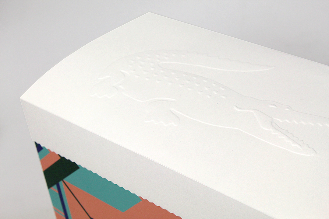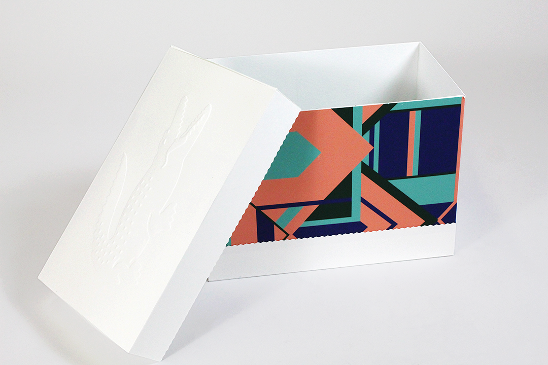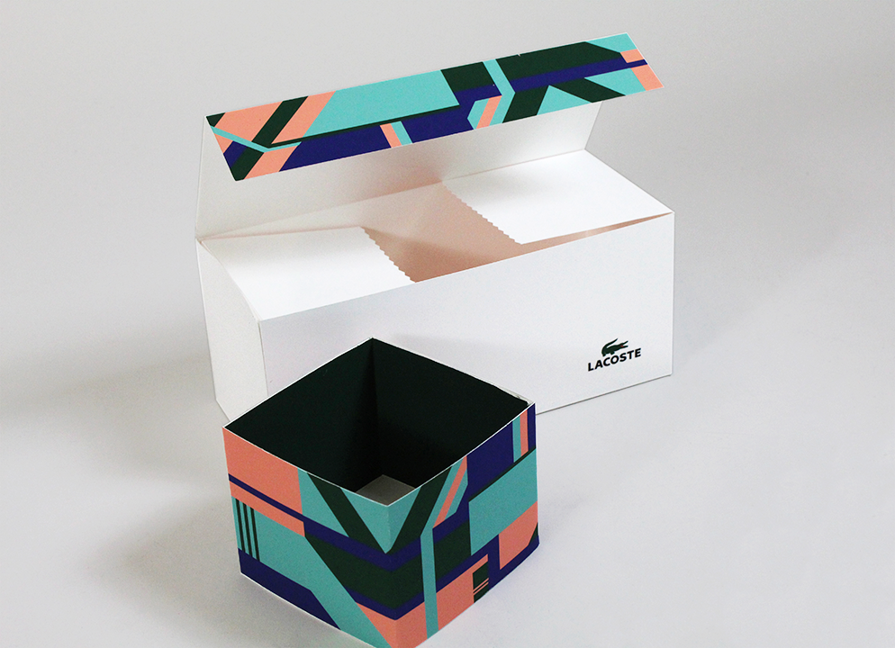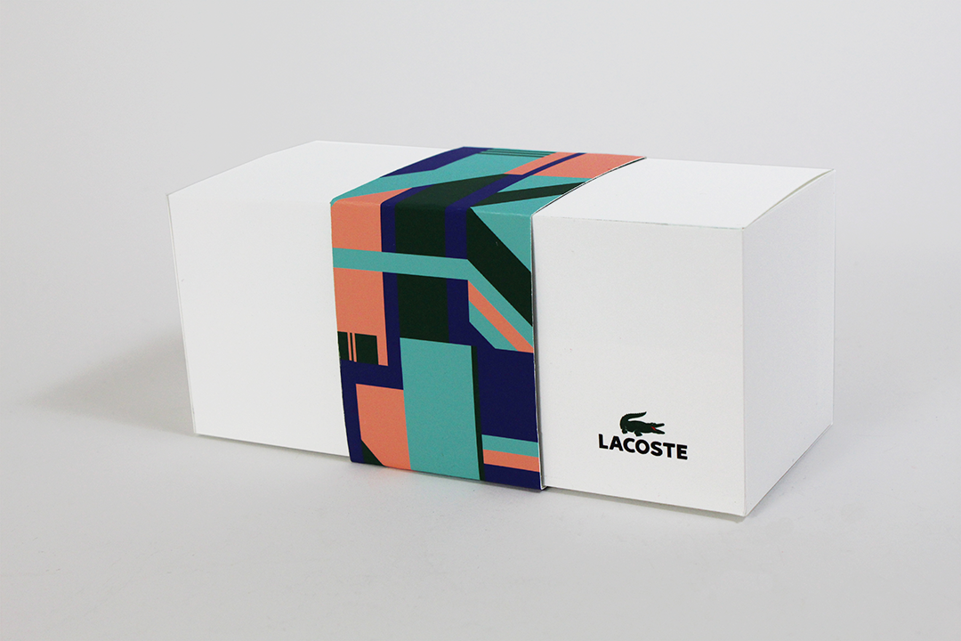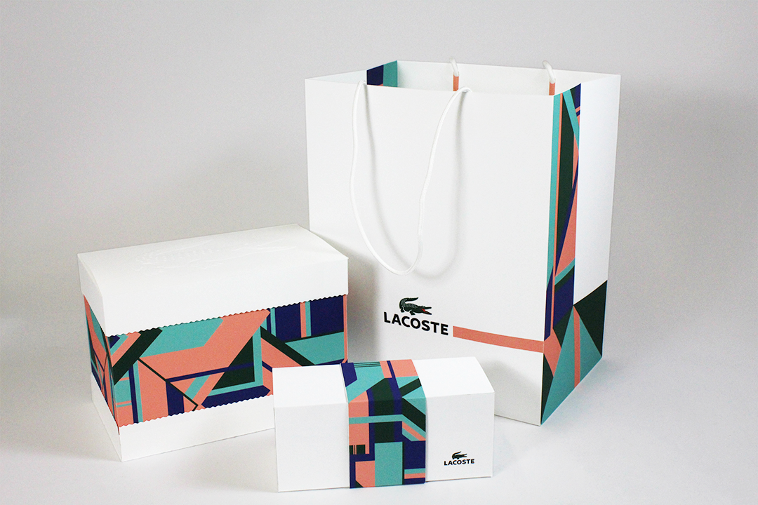 This Lacoste gift packaging redesign features a color palette inspired by the brand’s iconic polo shirts. The geometric pattern and double-embossed logo offer a fresh, bright take on the brand’s existing identity.